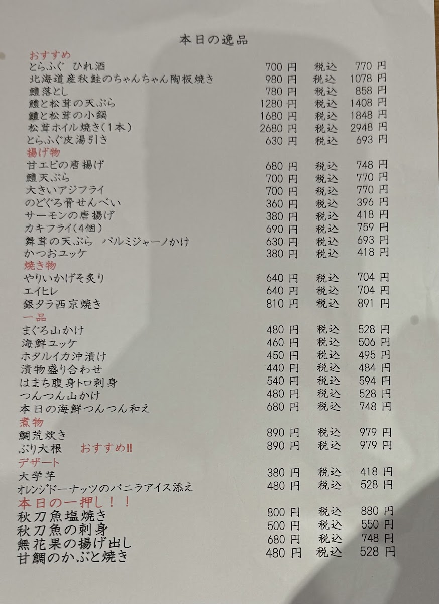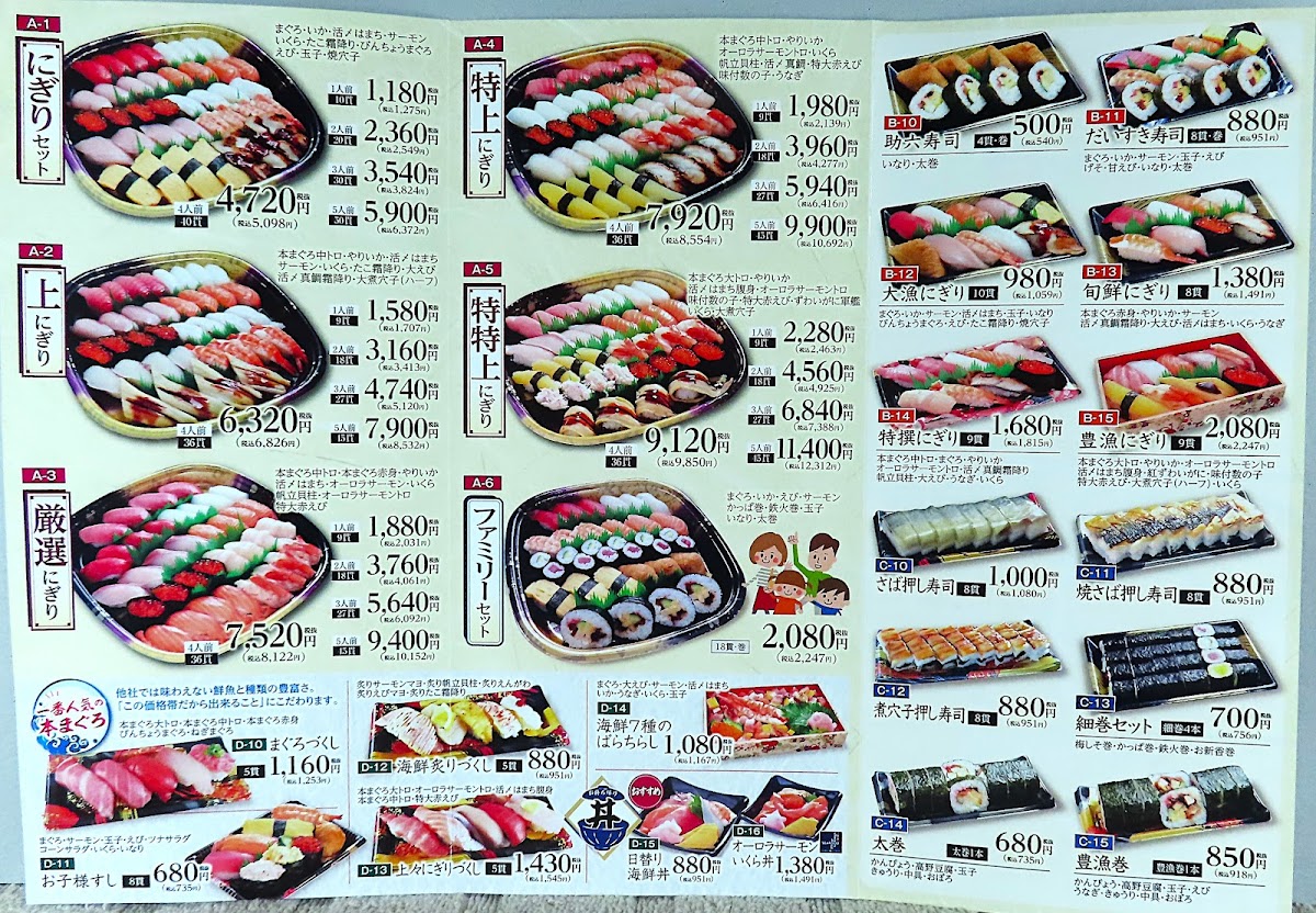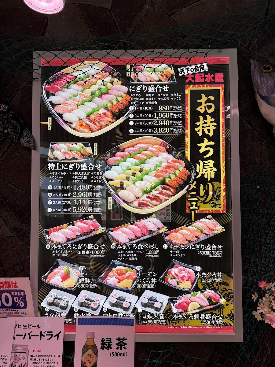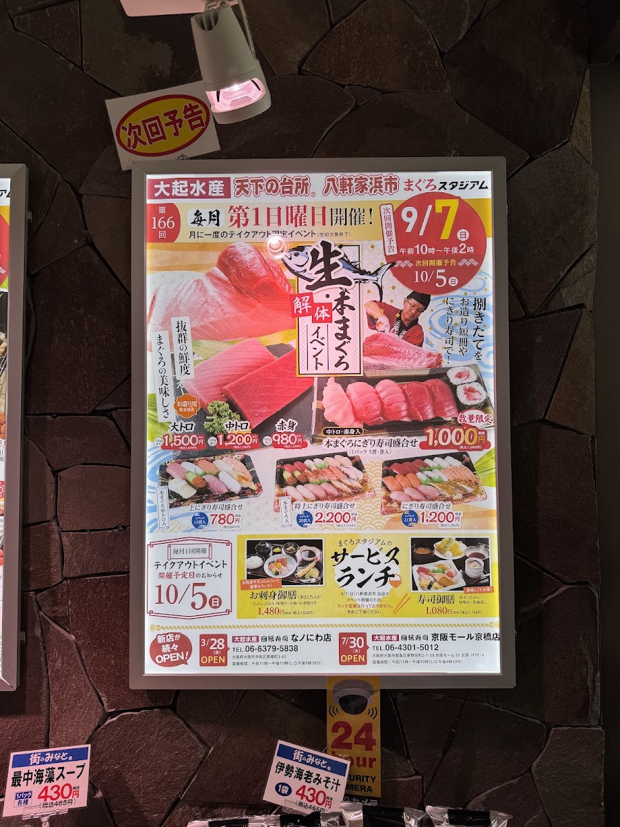 The menu at Tenka-No-Daidokoro Daiki-Suisan Hachikenyahama Maguro-Stadium in Osaka offers an inviting selection of dishes that highlight the freshness of their seafood. One standout option is the 酒と肴セット (Sake and Snacks Set), which is a unique dish limited to one per person, perfect for pairing with a drink. For sushi lovers, the restaurant provides a wide range of にぎり寿司 (nigiri sushi) options starting from 66円 (for a single piece), with other varieties available for 110円, 165円, and 198円 per piece, offering different levels of quality and flavor. The focus on fresh tuna (maguro) shines through in every dish, making this spot a must-visit for sushi enthusiasts. With its casual atmosphere and emphasis on quality, the restaurant is a delightful choice for anyone seeking authentic and reasonably priced sushi in Osaka.
